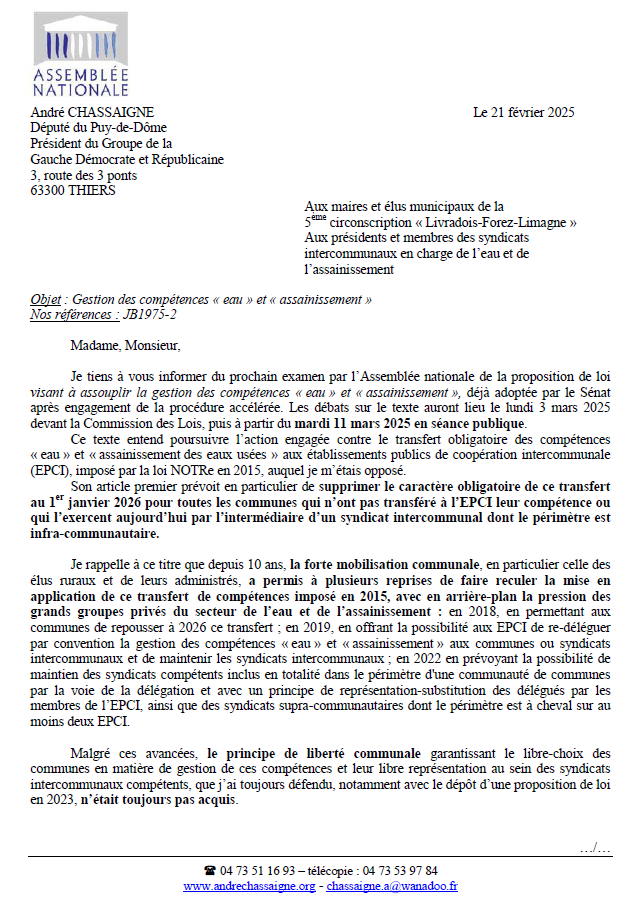 Gestion des compétences « Eau » et « Assainissement : courrier aux élus locaux